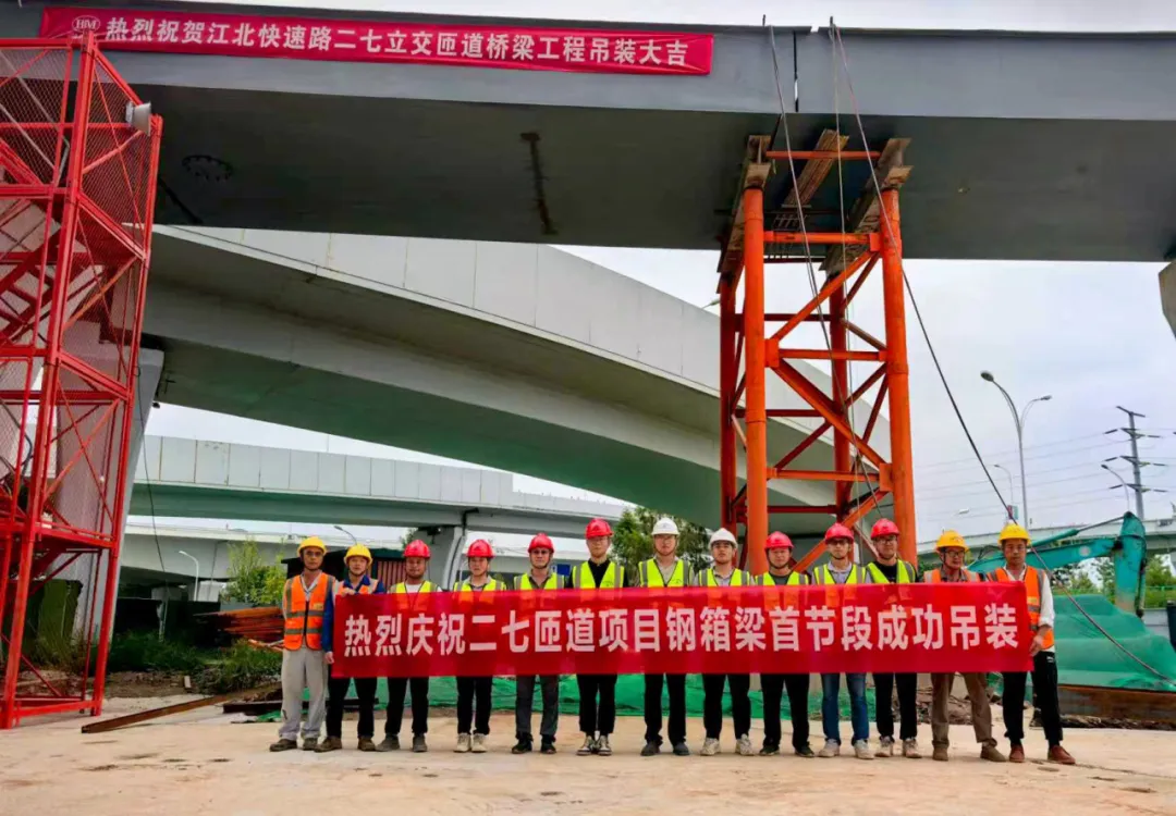 項(xiàng)目直擊丨江北快速路二七立交右轉(zhuǎn)匝道項(xiàng)目鋼箱梁首節(jié)段成功架設(shè)